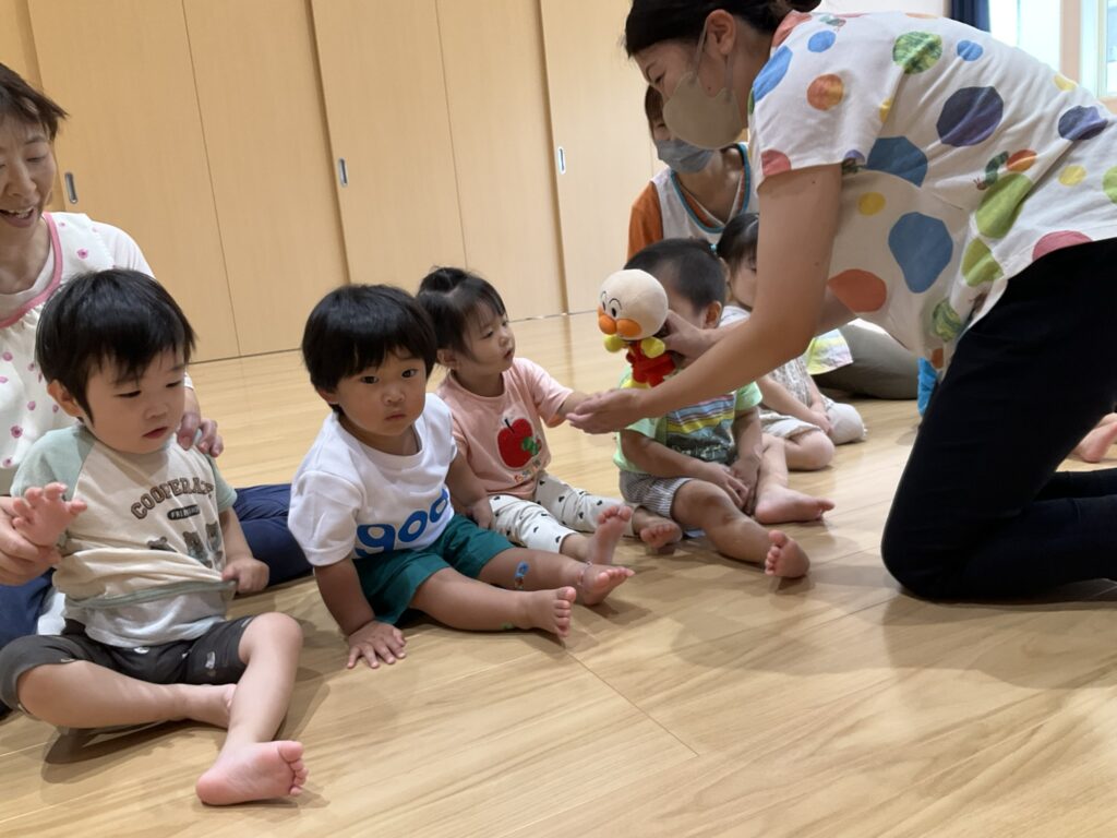 ♪バスごっこの歌に合わせて、アンパンマンから切符を順にもらいます!