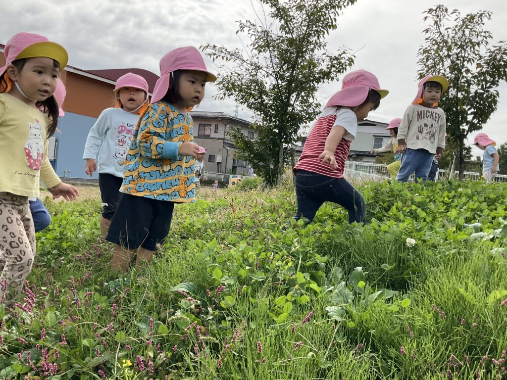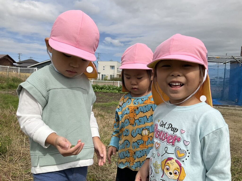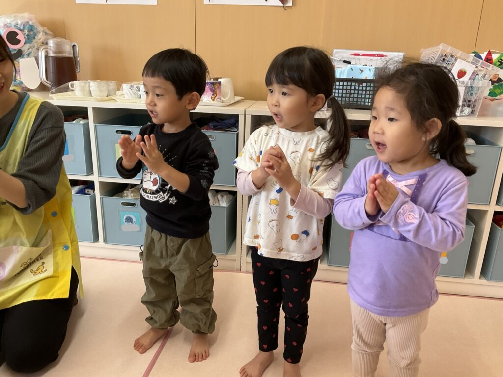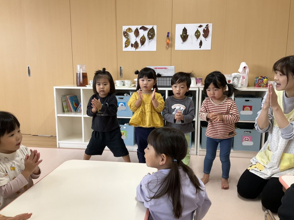 2025.10.20 🍓いちご組さんの様子 園庭あそび 手をつないで園庭へ向かいます😃 過ごしやすい気温になり、園庭で元気いっぱいに遊んでいます! 葉っぱの色づきの違いに気が付きました🌱 こちらは、「お風呂みた~い」とごっこ遊びを楽しんでいます😄 小さい組さんに話しかけていますね。 カエルをゲット! 虫探しをしているようです🦗 クイズです!この中に虫が隠れています。どこにいるか分かりますか? こちらの2人は、虫取り名人です👏 「パタパタ~」葉っぱを羽に見立てていますね。 葉っぱがお面に変身〜。 「おばけだよ~」と見せてくれました👻 一緒に遊ぶと楽しいね😊 虫探し、ままごと、草花摘み…それぞれで好きなあそびを見つけています。秋ならではの遊びを存分に楽しみながら過ごしたいちご組さんでした! お当番活動 お当番活動に取り組んでいます。朝、給食、おやつの挨拶を前に出てしています🙂 「ご一緒に、いただきます。」と元気に挨拶をしてくれました。 今日のお当番はだれかな?と子ども達は、ボードを見ています。先生のお手伝い、いつもありがとう❤️! 子どもたちの様子 今日の子どもたち < 前の記事 記事一覧