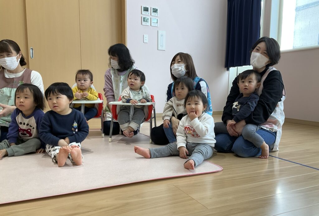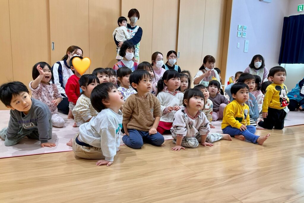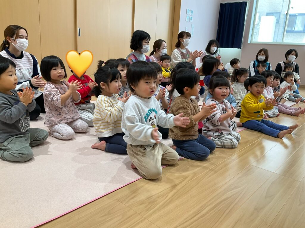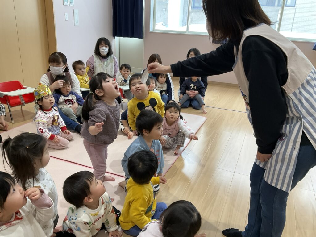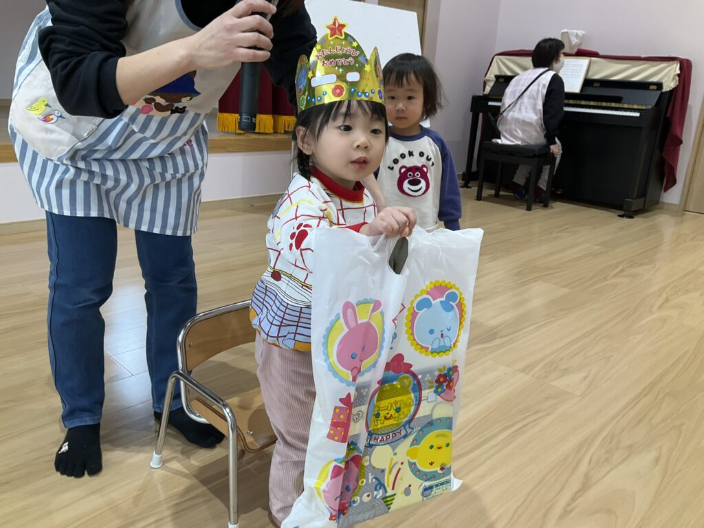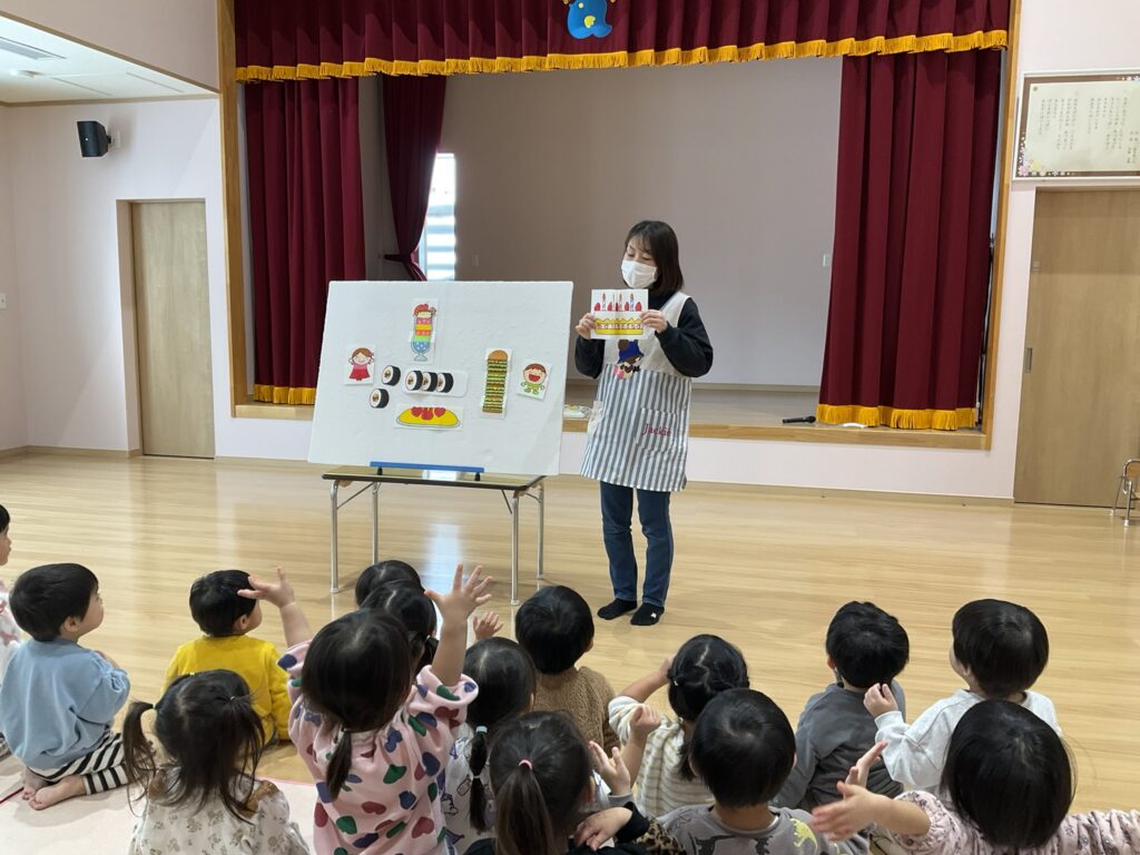 先生からのプレゼントは「びよ~ん」というパネルシアターです。呪文を唱えると食べ物が大きくなります。みんなで「おおきくなあれ!びよ~ん!」とお手伝いしてくれました!