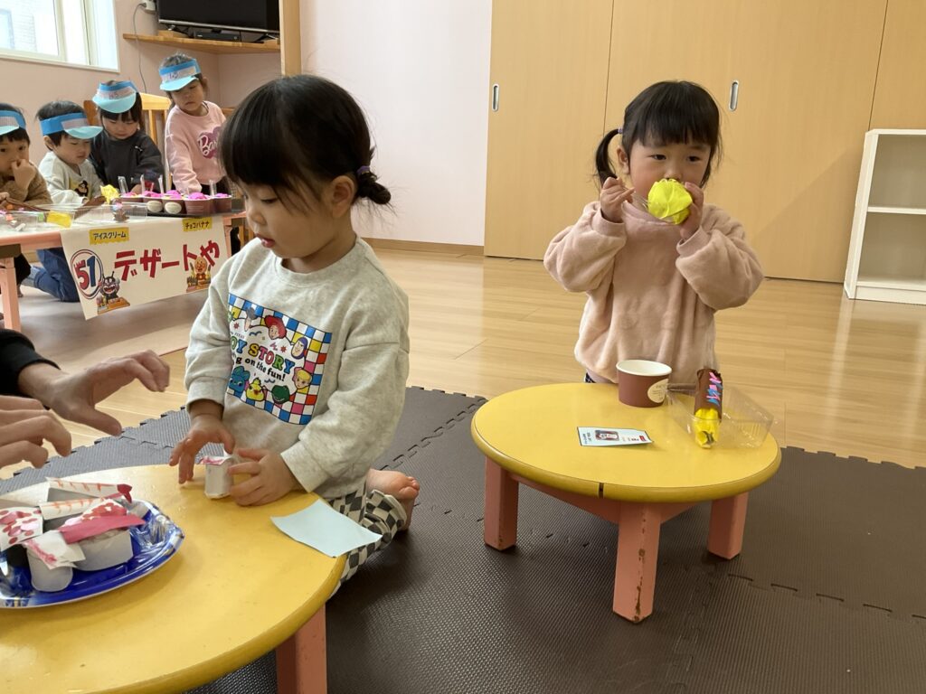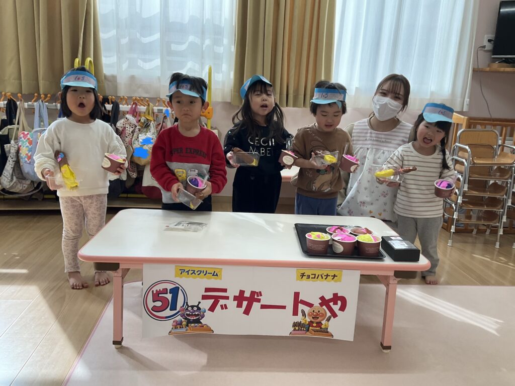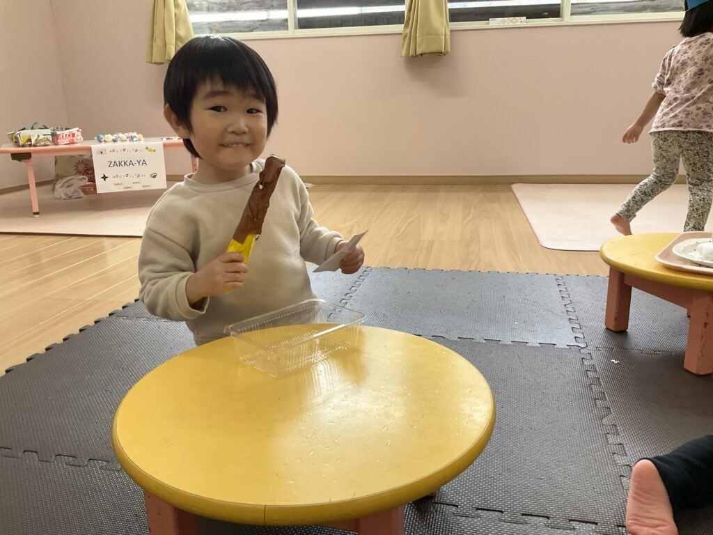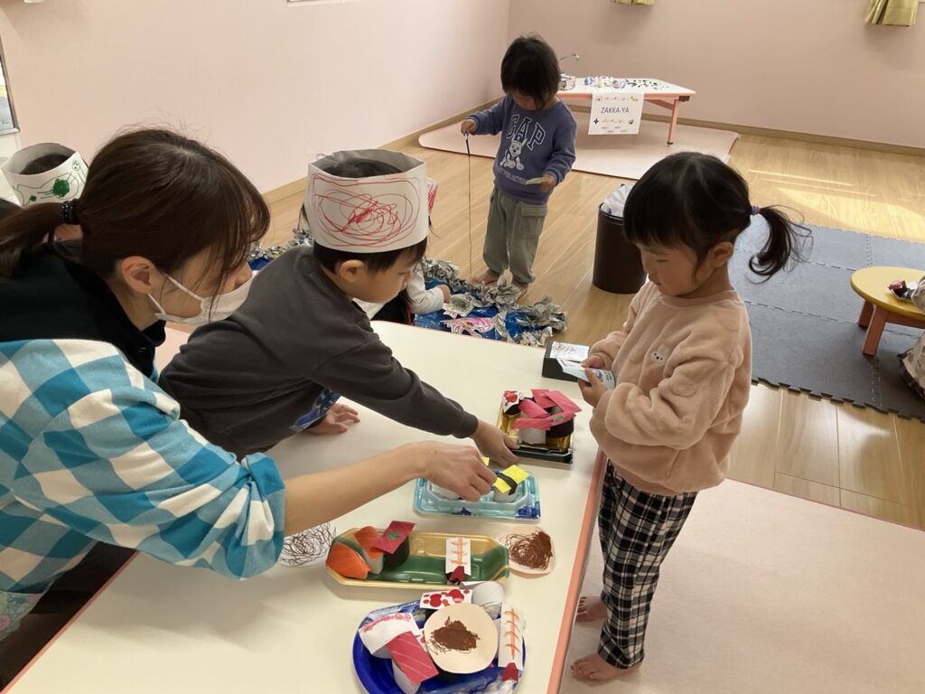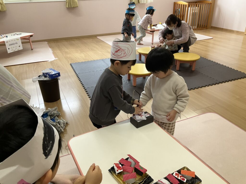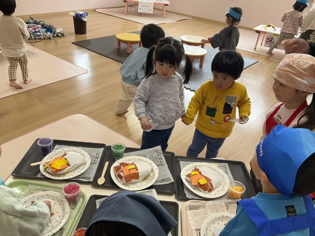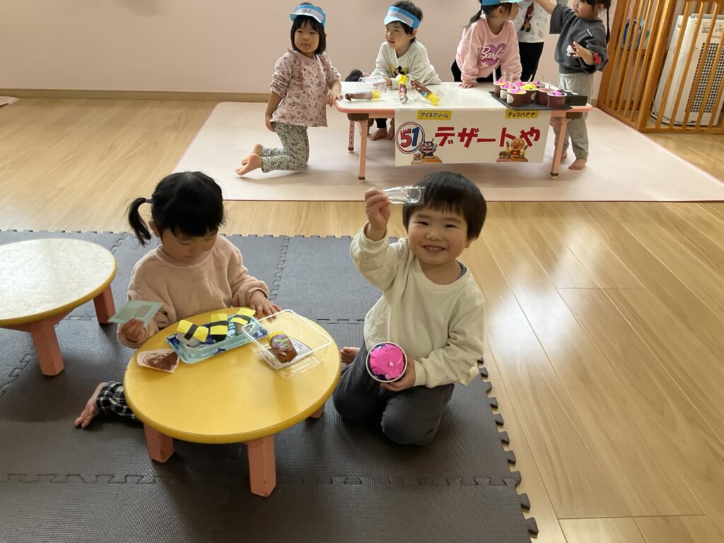 2026.03.04 あおぞらマーケット開店! お買い物ごっこの準備です😀 いちご組で、お買い物ごっこを計画しました♪ 自分達で出店する品物を考え、その品物を製作中です。 オープンまで準備頑張ります😊 チームおすし&魚釣り屋! チームカレー屋! チームデザート屋! お店屋さんごっこ、オープンです! 2月19日(木)おみせやさんごっこ当日です! カレーやさん、オープンです✨ 「いらっしゃいませ~♡」甘くておいしいデザートはいかがですか? 「すみません、カレーライスください♡」もも組さんも上手に買い物しています。 「ゼリーおいしそうだな!」 みんなでいただきます! カレーライスおいしそう🥄食べたいなぁ! もも組が帰った後はちゃんとテーブルを拭いてお掃除。きれいにしてからめろん組さんを迎えます。 「どれにする?」迷うね…。 デザート大好き♡ いっぱいください♡ 「ありがとう!」「気をつけてもってくださいね!」 「たまごのお寿司おいしいなぁ♡」 「これ、いかがですか?」 「おいしいよ♥せんせいもたべる?」 「おいしいね!」 おみせやさんとお客さんのやりとり…上手ですね! 食べ物ぜ~んぶ食べようか♡ 「どこからたべようかな!」 ペイペイカードの仕方を丁寧に教えてくれています。 いっぱいお魚釣るぞー! 「みんなで食べるとおいしいね!」 ペイペイカードに慣れてきたよ!上手でしょ! 「おいしい!」 嬉しそう♡自然に笑顔がこぼれます! 最後はきれいにテーブルを拭いてお掃除。 最後はいちご組さんがお店屋さんごっこを楽しみました! 「いらっしゃいませ!」「ありがとうございました。」 「カレーライスいかがですか?」おみせやさんも上手になってきました! 「これください!」「チョコバナナおいしいですよ!」 「これください♡」「おいしそうですね❤」 おいしいなぁ。ほんとに食べれたら最高だね! 「いらっしゃいませ!」「気をつけておもちください!」 「カレーライスどうぞ!」「ちょっと恥ずかしいなぁ…」 魚釣り…なかなか難しいなぁ。 「これください!」「わたしは…どれにしようかな?」 先生のお店『ざっかやさん』いろんなものを買いました! 「なにかなぁ?」 「かわいいなぁ♡」 「おいしそうだな。どれにしようか?」 「おみせやさんごっこたのしいなぁ♡」 みんなでおみせやさんごっこを楽しむことができました!準備をしてくれたいちご組さんありがとう♡ イベント < 前の記事 記事一覧