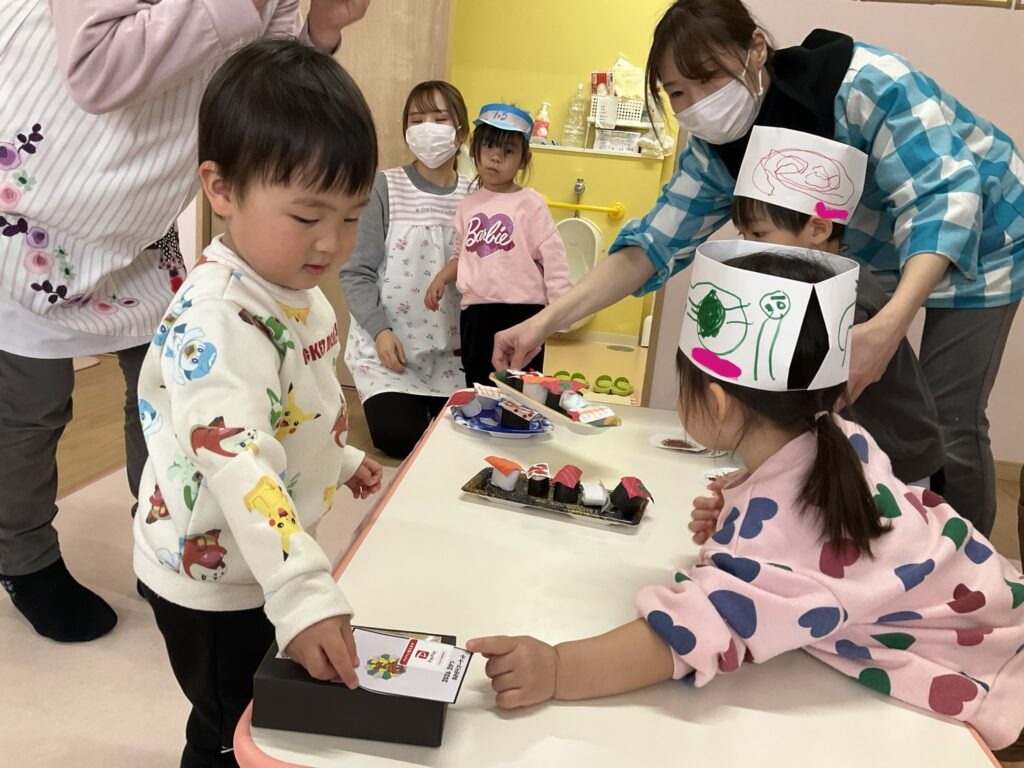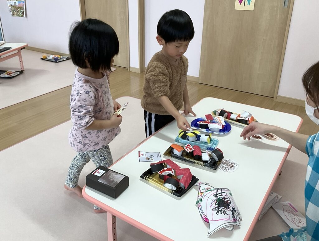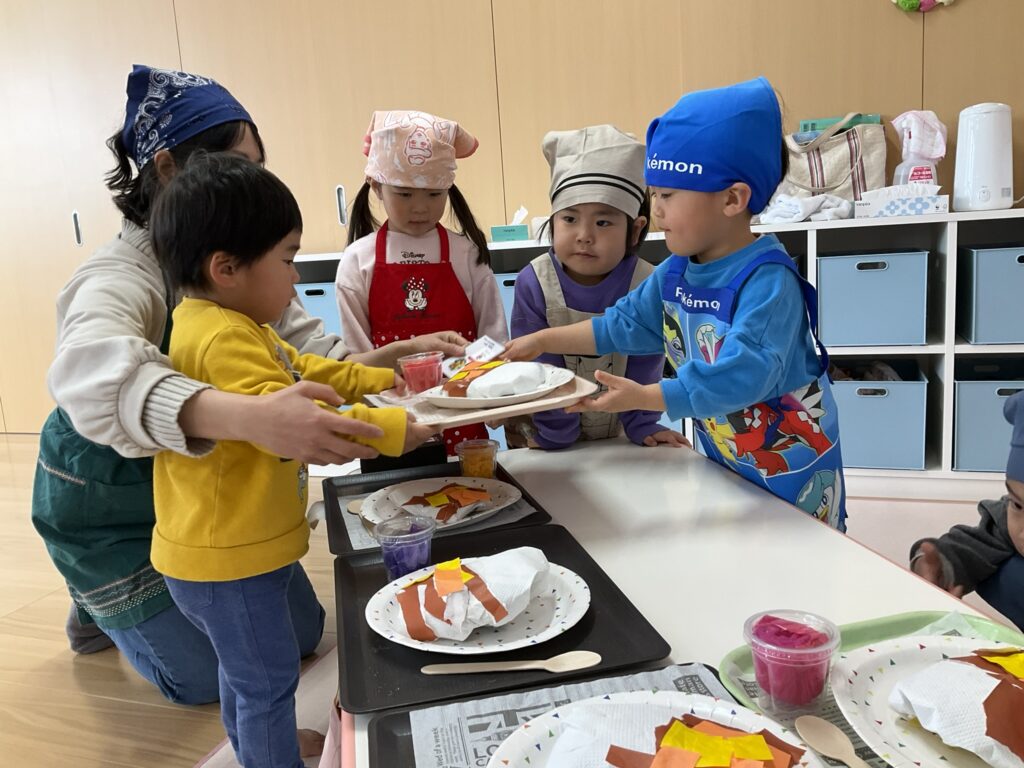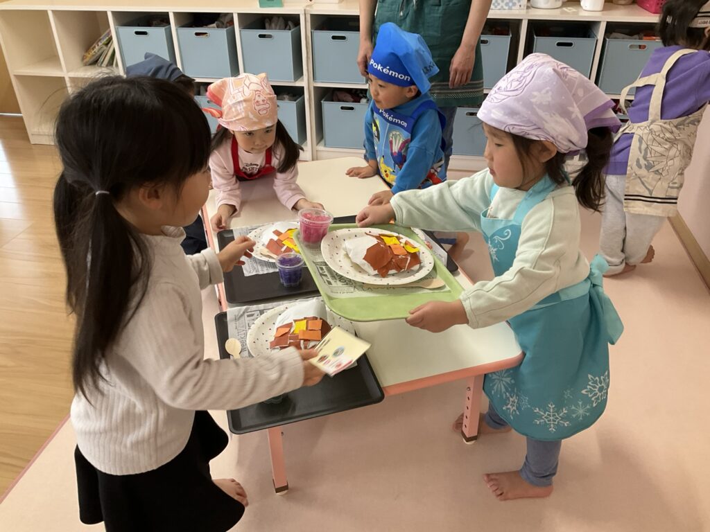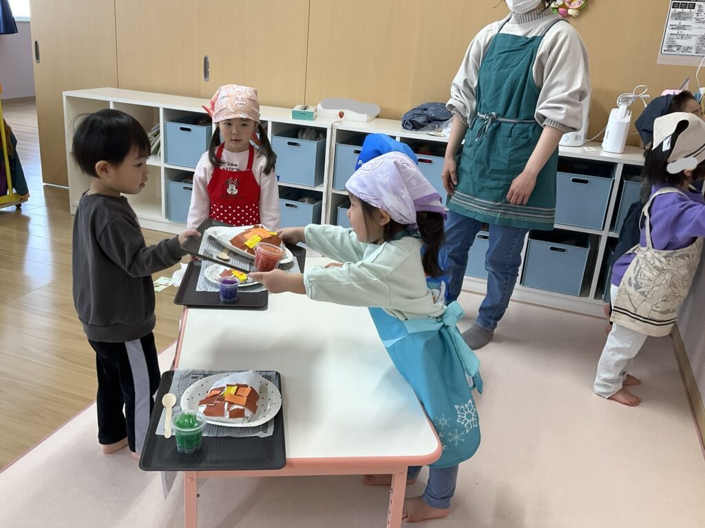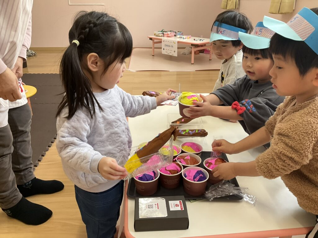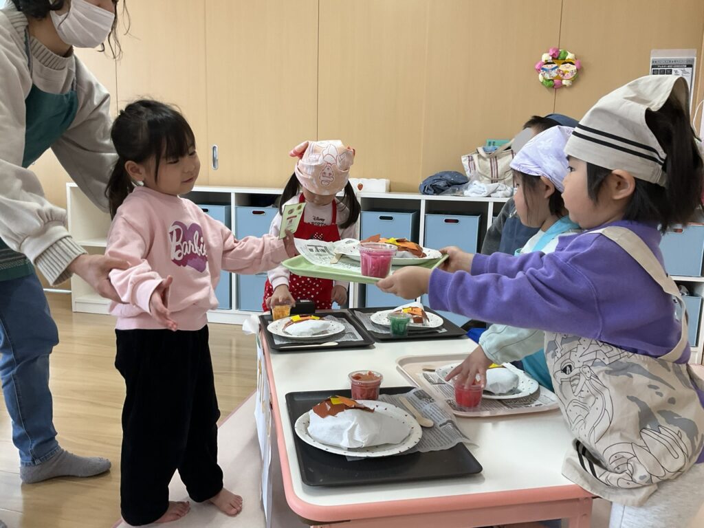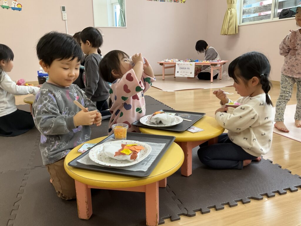 2026.03.04 あおぞらマーケット開店! お買い物ごっこの準備です😀 いちご組で、お買い物ごっこを計画しました♪ 自分達で出店する品物を考え、その品物を製作中です。 オープンまで準備頑張ります😊 チームおすし&魚釣り屋! チームカレー屋! チームデザート屋! お店屋さんごっこ、オープンです! 2月19日(木)おみせやさんごっこ当日です! カレーやさん、オープンです✨ 「いらっしゃいませ~♡」甘くておいしいデザートはいかがですか? 「すみません、カレーライスください♡」もも組さんも上手に買い物しています。 「ゼリーおいしそうだな!」 みんなでいただきます! カレーライスおいしそう🥄食べたいなぁ! もも組が帰った後はちゃんとテーブルを拭いてお掃除。きれいにしてからめろん組さんを迎えます。 「どれにする?」迷うね…。 デザート大好き♡ いっぱいください♡ 「ありがとう!」「気をつけてもってくださいね!」 「たまごのお寿司おいしいなぁ♡」 「これ、いかがですか?」 「おいしいよ♥せんせいもたべる?」 「おいしいね!」 おみせやさんとお客さんのやりとり…上手ですね! 食べ物ぜ~んぶ食べようか♡ 「どこからたべようかな!」 ペイペイカードの仕方を丁寧に教えてくれています。 いっぱいお魚釣るぞー! 「みんなで食べるとおいしいね!」 ペイペイカードに慣れてきたよ!上手でしょ! 「おいしい!」 嬉しそう♡自然に笑顔がこぼれます! 最後はきれいにテーブルを拭いてお掃除。 最後はいちご組さんがお店屋さんごっこを楽しみました! 「いらっしゃいませ!」「ありがとうございました。」 「カレーライスいかがですか?」おみせやさんも上手になってきました! 「これください!」「チョコバナナおいしいですよ!」 「これください♡」「おいしそうですね❤」 おいしいなぁ。ほんとに食べれたら最高だね! 「いらっしゃいませ!」「気をつけておもちください!」 「カレーライスどうぞ!」「ちょっと恥ずかしいなぁ…」 魚釣り…なかなか難しいなぁ。 「これください!」「わたしは…どれにしようかな?」 先生のお店『ざっかやさん』いろんなものを買いました! 「なにかなぁ?」 「かわいいなぁ♡」 「おいしそうだな。どれにしようか?」 「おみせやさんごっこたのしいなぁ♡」 みんなでおみせやさんごっこを楽しむことができました!準備をしてくれたいちご組さんありがとう♡ イベント < 前の記事 記事一覧
