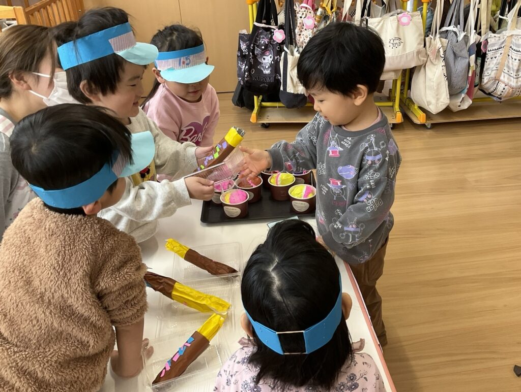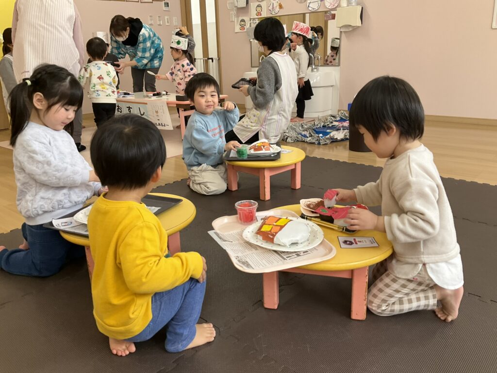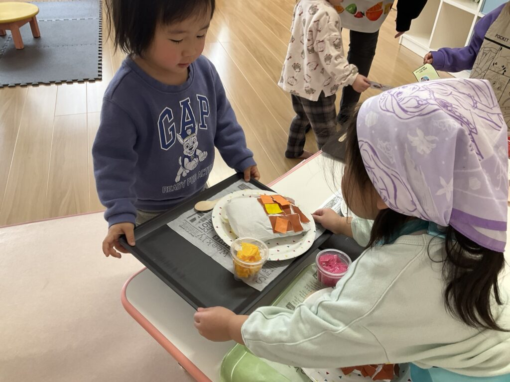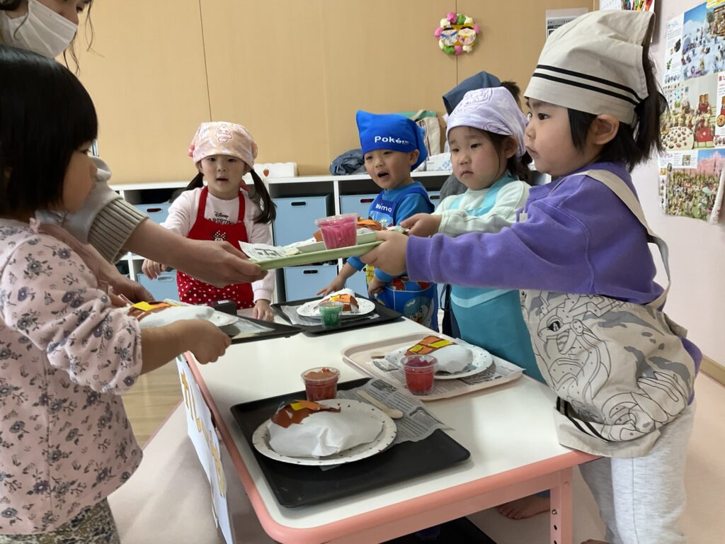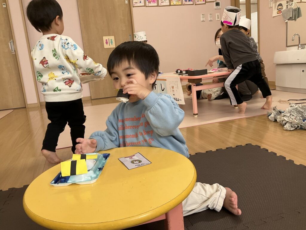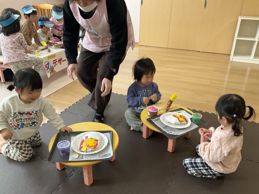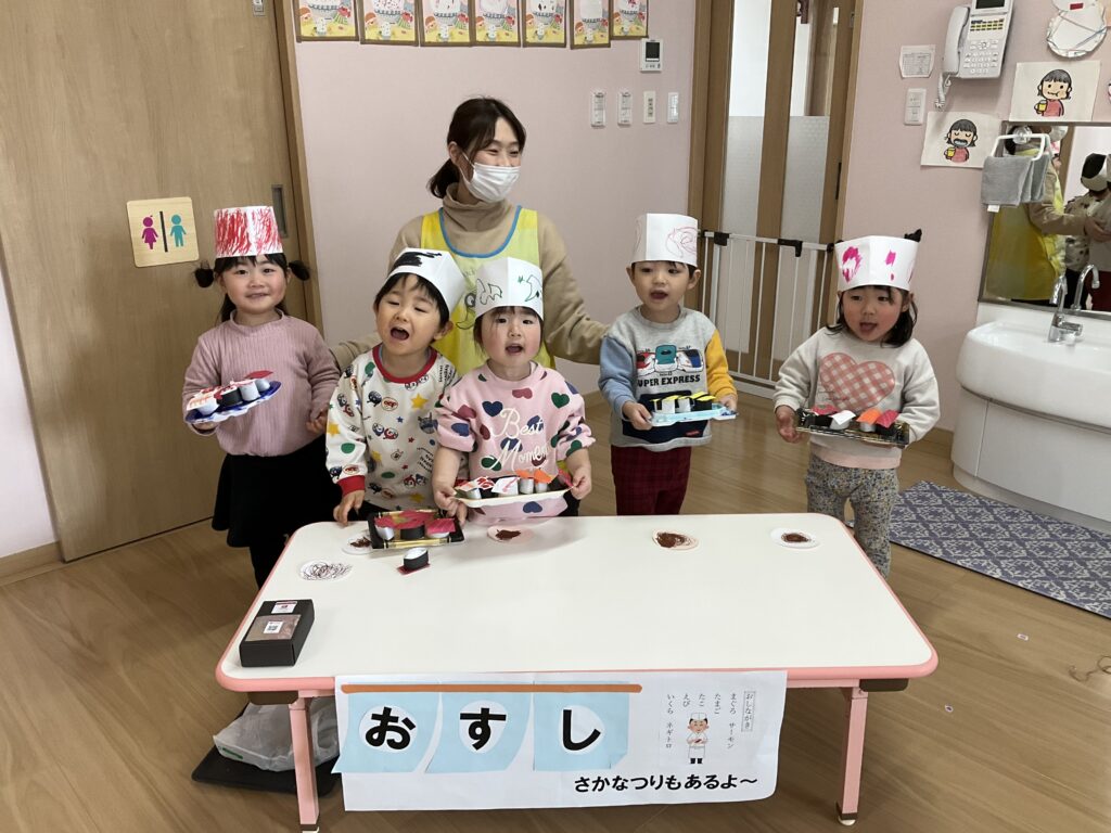 2026.03.04 あおぞらマーケット開店! お買い物ごっこの準備です😀 いちご組で、お買い物ごっこを計画しました♪ 自分達で出店する品物を考え、その品物を製作中です。 オープンまで準備頑張ります😊 チームおすし&魚釣り屋! チームカレー屋! チームデザート屋! お店屋さんごっこ、オープンです! 2月19日(木)おみせやさんごっこ当日です! カレーやさん、オープンです✨ 「いらっしゃいませ~♡」甘くておいしいデザートはいかがですか? 「すみません、カレーライスください♡」もも組さんも上手に買い物しています。 「ゼリーおいしそうだな!」 みんなでいただきます! カレーライスおいしそう🥄食べたいなぁ! もも組が帰った後はちゃんとテーブルを拭いてお掃除。きれいにしてからめろん組さんを迎えます。 「どれにする?」迷うね…。 デザート大好き♡ いっぱいください♡ 「ありがとう!」「気をつけてもってくださいね!」 「たまごのお寿司おいしいなぁ♡」 「これ、いかがですか?」 「おいしいよ♥せんせいもたべる?」 「おいしいね!」 おみせやさんとお客さんのやりとり…上手ですね! 食べ物ぜ~んぶ食べようか♡ 「どこからたべようかな!」 ペイペイカードの仕方を丁寧に教えてくれています。 いっぱいお魚釣るぞー! 「みんなで食べるとおいしいね!」 ペイペイカードに慣れてきたよ!上手でしょ! 「おいしい!」 嬉しそう♡自然に笑顔がこぼれます! 最後はきれいにテーブルを拭いてお掃除。 最後はいちご組さんがお店屋さんごっこを楽しみました! 「いらっしゃいませ!」「ありがとうございました。」 「カレーライスいかがですか?」おみせやさんも上手になってきました! 「これください!」「チョコバナナおいしいですよ!」 「これください♡」「おいしそうですね❤」 おいしいなぁ。ほんとに食べれたら最高だね! 「いらっしゃいませ!」「気をつけておもちください!」 「カレーライスどうぞ!」「ちょっと恥ずかしいなぁ…」 魚釣り…なかなか難しいなぁ。 「これください!」「わたしは…どれにしようかな?」 先生のお店『ざっかやさん』いろんなものを買いました! 「なにかなぁ?」 「かわいいなぁ♡」 「おいしそうだな。どれにしようか?」 「おみせやさんごっこたのしいなぁ♡」 みんなでおみせやさんごっこを楽しむことができました!準備をしてくれたいちご組さんありがとう♡ イベント < 前の記事 記事一覧
