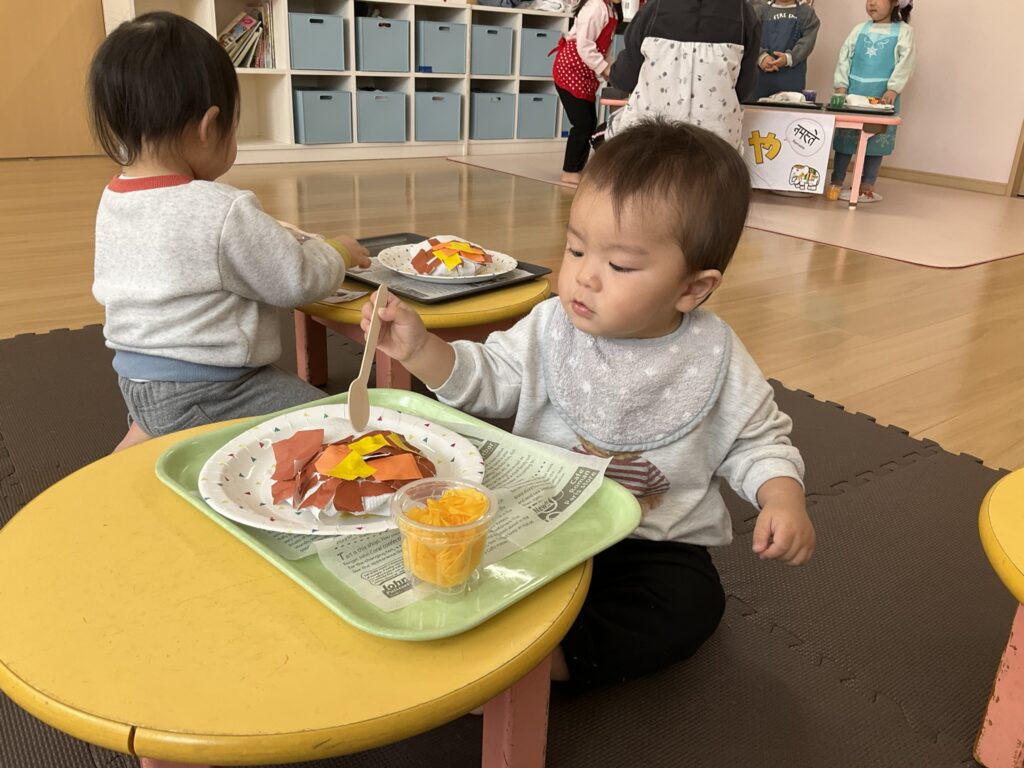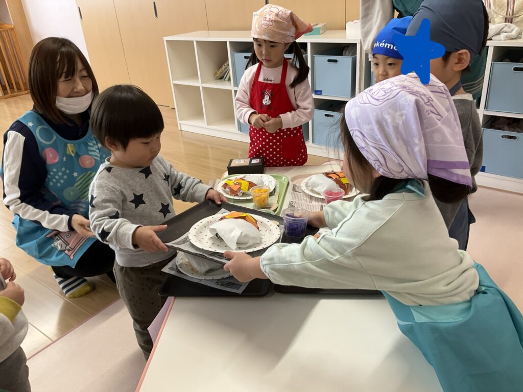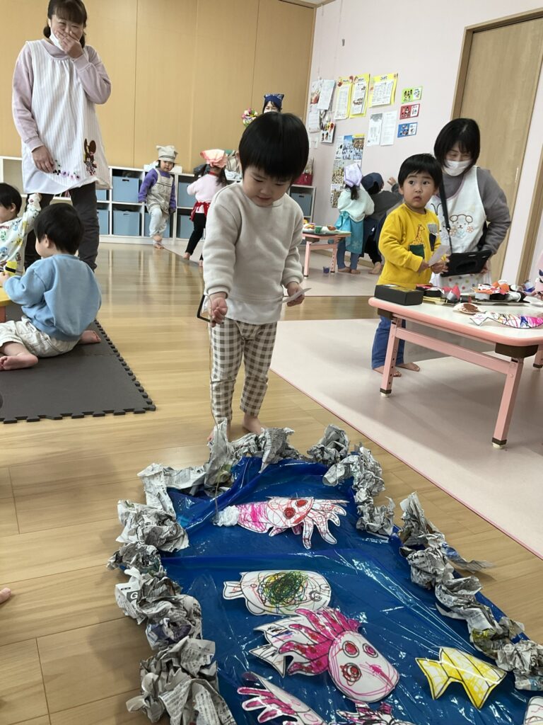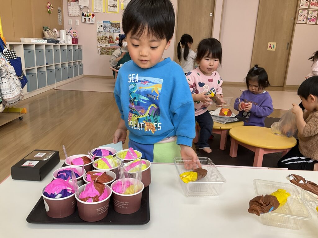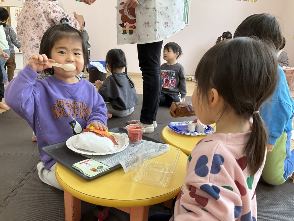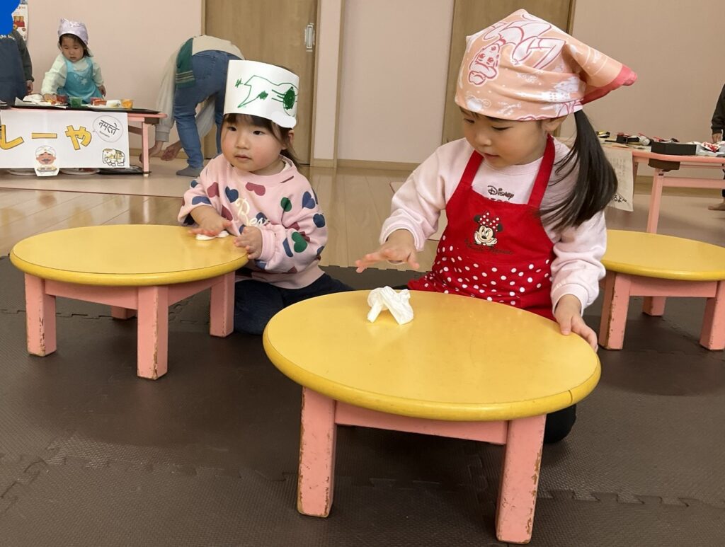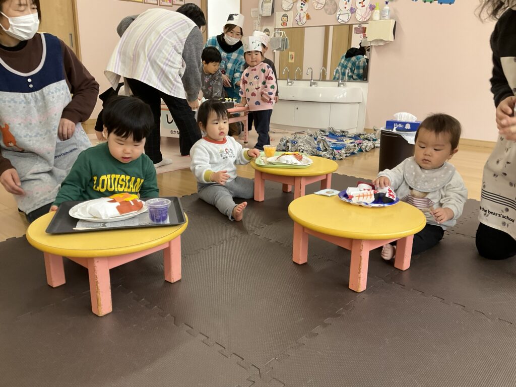 2026.03.04 あおぞらマーケット開店! お買い物ごっこの準備です😀 いちご組で、お買い物ごっこを計画しました♪ 自分達で出店する品物を考え、その品物を製作中です。 オープンまで準備頑張ります😊 チームおすし&魚釣り屋! チームカレー屋! チームデザート屋! お店屋さんごっこ、オープンです! 2月19日(木)おみせやさんごっこ当日です! カレーやさん、オープンです✨ 「いらっしゃいませ~♡」甘くておいしいデザートはいかがですか? 「すみません、カレーライスください♡」もも組さんも上手に買い物しています。 「ゼリーおいしそうだな!」 みんなでいただきます! カレーライスおいしそう🥄食べたいなぁ! もも組が帰った後はちゃんとテーブルを拭いてお掃除。きれいにしてからめろん組さんを迎えます。 「どれにする?」迷うね…。 デザート大好き♡ いっぱいください♡ 「ありがとう!」「気をつけてもってくださいね!」 「たまごのお寿司おいしいなぁ♡」 「これ、いかがですか?」 「おいしいよ♥せんせいもたべる?」 「おいしいね!」 おみせやさんとお客さんのやりとり…上手ですね! 食べ物ぜ~んぶ食べようか♡ 「どこからたべようかな!」 ペイペイカードの仕方を丁寧に教えてくれています。 いっぱいお魚釣るぞー! 「みんなで食べるとおいしいね!」 ペイペイカードに慣れてきたよ!上手でしょ! 「おいしい!」 嬉しそう♡自然に笑顔がこぼれます! 最後はきれいにテーブルを拭いてお掃除。 最後はいちご組さんがお店屋さんごっこを楽しみました! 「いらっしゃいませ!」「ありがとうございました。」 「カレーライスいかがですか?」おみせやさんも上手になってきました! 「これください!」「チョコバナナおいしいですよ!」 「これください♡」「おいしそうですね❤」 おいしいなぁ。ほんとに食べれたら最高だね! 「いらっしゃいませ!」「気をつけておもちください!」 「カレーライスどうぞ!」「ちょっと恥ずかしいなぁ…」 魚釣り…なかなか難しいなぁ。 「これください!」「わたしは…どれにしようかな?」 先生のお店『ざっかやさん』いろんなものを買いました! 「なにかなぁ?」 「かわいいなぁ♡」 「おいしそうだな。どれにしようか?」 「おみせやさんごっこたのしいなぁ♡」 みんなでおみせやさんごっこを楽しむことができました!準備をしてくれたいちご組さんありがとう♡ イベント < 前の記事 記事一覧