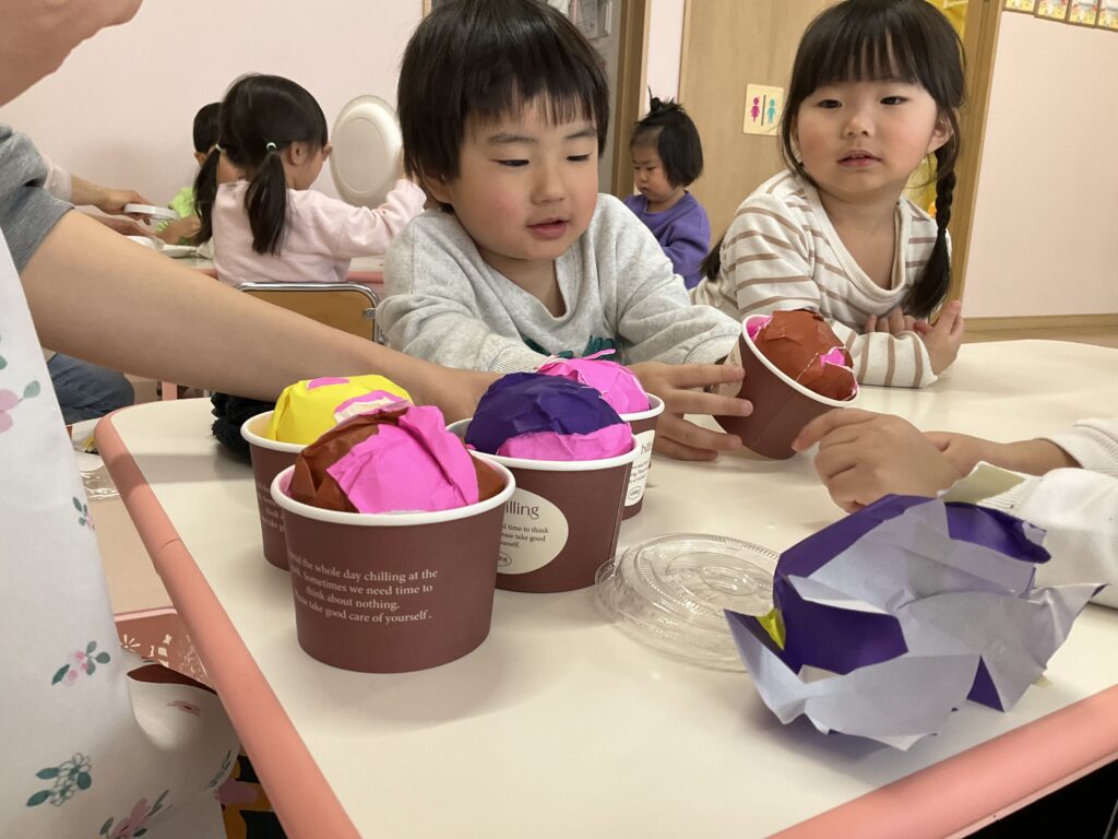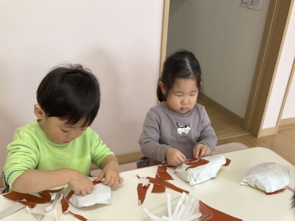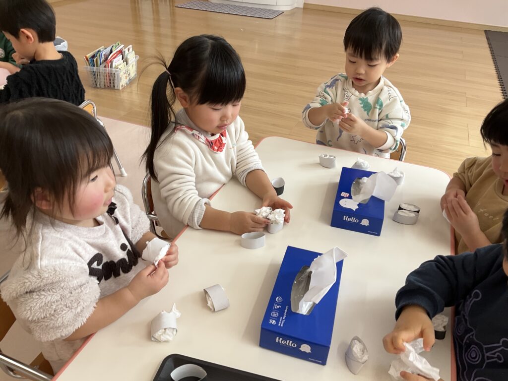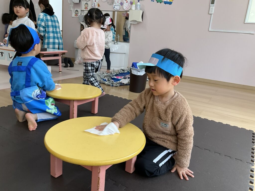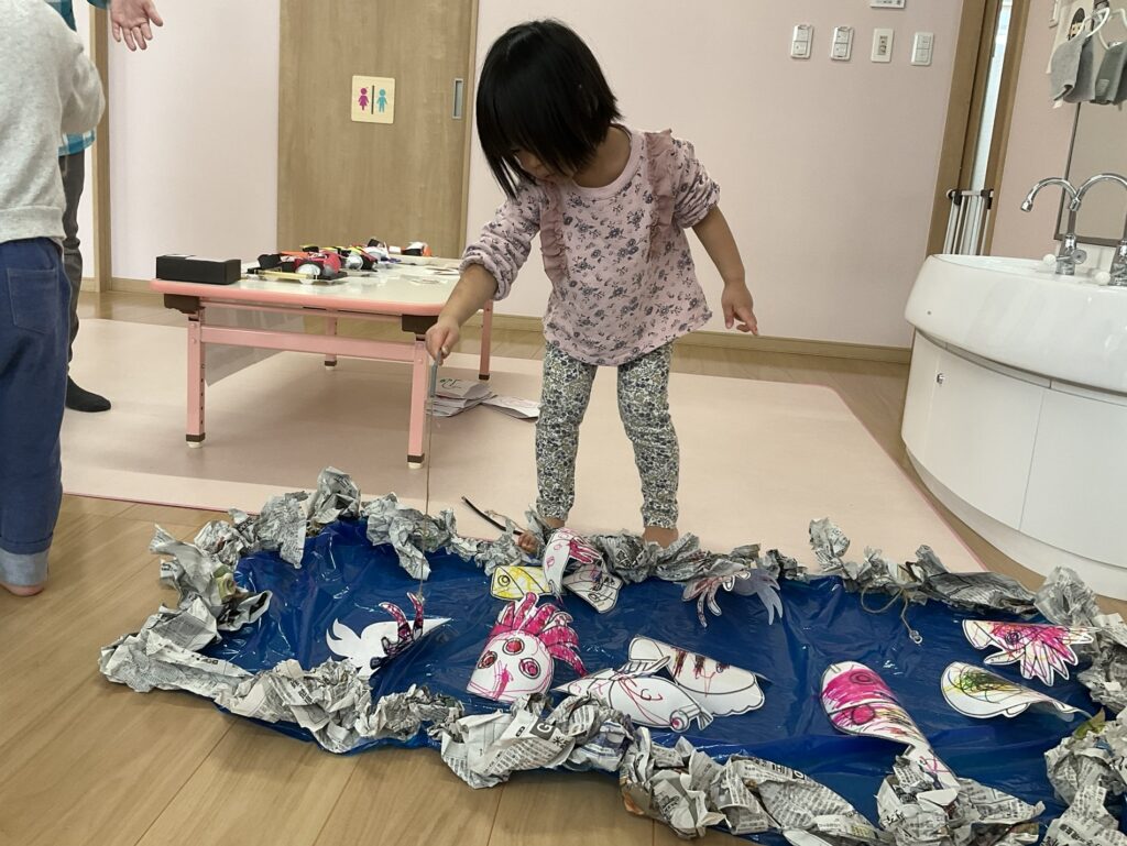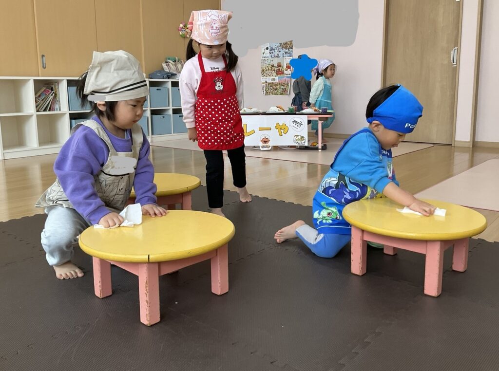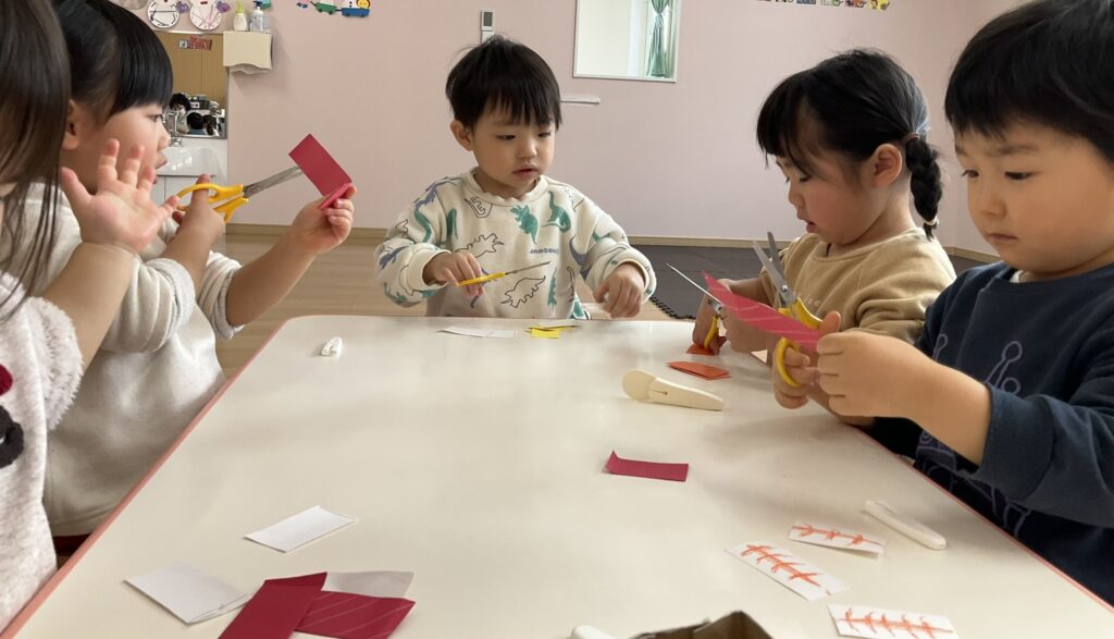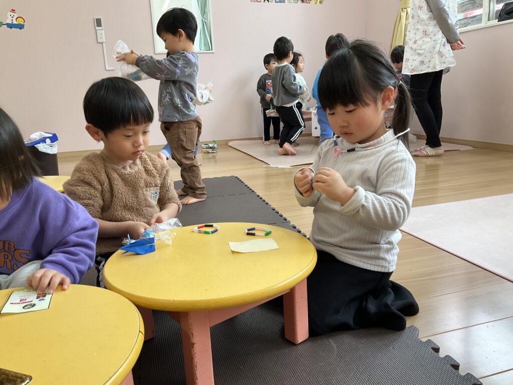2026.03.04 あおぞらマーケット開店! お買い物ごっこの準備です😀 いちご組で、お買い物ごっこを計画しました♪ 自分達で出店する品物を考え、その品物を製作中です。 オープンまで準備頑張ります😊 チームおすし&魚釣り屋! チームカレー屋! チームデザート屋! お店屋さんごっこ、オープンです! 2月19日(木)おみせやさんごっこ当日です! カレーやさん、オープンです✨ 「いらっしゃいませ~♡」甘くておいしいデザートはいかがですか? 「すみません、カレーライスください♡」もも組さんも上手に買い物しています。 「ゼリーおいしそうだな!」 みんなでいただきます! カレーライスおいしそう🥄食べたいなぁ! もも組が帰った後はちゃんとテーブルを拭いてお掃除。きれいにしてからめろん組さんを迎えます。 「どれにする?」迷うね…。 デザート大好き♡ いっぱいください♡ 「ありがとう!」「気をつけてもってくださいね!」 「たまごのお寿司おいしいなぁ♡」 「これ、いかがですか?」 「おいしいよ♥せんせいもたべる?」 「おいしいね!」 おみせやさんとお客さんのやりとり…上手ですね! 食べ物ぜ~んぶ食べようか♡ 「どこからたべようかな!」 ペイペイカードの仕方を丁寧に教えてくれています。 いっぱいお魚釣るぞー! 「みんなで食べるとおいしいね!」 ペイペイカードに慣れてきたよ!上手でしょ! 「おいしい!」 嬉しそう♡自然に笑顔がこぼれます! 最後はきれいにテーブルを拭いてお掃除。 最後はいちご組さんがお店屋さんごっこを楽しみました! 「いらっしゃいませ!」「ありがとうございました。」 「カレーライスいかがですか?」おみせやさんも上手になってきました! 「これください!」「チョコバナナおいしいですよ!」 「これください♡」「おいしそうですね❤」 おいしいなぁ。ほんとに食べれたら最高だね! 「いらっしゃいませ!」「気をつけておもちください!」 「カレーライスどうぞ!」「ちょっと恥ずかしいなぁ…」 魚釣り…なかなか難しいなぁ。 「これください!」「わたしは…どれにしようかな?」 先生のお店『ざっかやさん』いろんなものを買いました! 「なにかなぁ?」 「かわいいなぁ♡」 「おいしそうだな。どれにしようか?」 「おみせやさんごっこたのしいなぁ♡」 みんなでおみせやさんごっこを楽しむことができました!準備をしてくれたいちご組さんありがとう♡ イベント < 前の記事 記事一覧